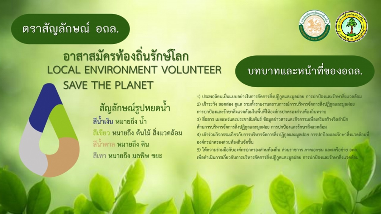 ตราสัญลักษณ์ อาสาสมัครท้องถิ่นรักโลก “อาสาสมัครท้องถิ่นรักษ์โลก” หมายความว่า ประชาชนที่มีจิตอาสา สมัครใจ เสียสละ และอุทิศตน เพื่อช่วยเหลืองานด้านการจัดการสิ่งปฏิกูลและมูลฝอย การปกป้อง และรักษาทรัพยากรธรรมชาติ และสิ่งแวดล้อมขององค์กรปกครองส่วนท้องถิ่น ใช้ชื่อย่อว่า “อถล.”มีชื่อเรียกภาษาอังกฤษว่า “Local Environment Volunteer” และใช้ชื่อย่อภาษาอังกฤษว่า “LEV”“เครือข่ายอาสาสมัครท้องถิ่นรักษ์โลก” หมายความว่า การเชื่อมโยงกันของ อถล. เพื่อการเรียนรู้แลกเปลี่ยนข่าวสาร หรือทํากิจกรรมร่วมกันในการบริหารจัดการสิ่งปฏิกูลและมูลฝอย รักษาสิ่งแวดล้อมและทรัพยากรธรรมชาติด้วยความเป็นอิสระและเท่าเทียมกันของบุคคลภายใต้พื้นฐานการเคารพสิทธิและเอื้ออาทรซึ่งกันและกัน และใช้หลักธรรมาภิบาลในการทํางานร่วมกัน โดยใช้ชื่อย่อว่า“เครือข่าย อถล.” และเรียกชื่อภาษาอังกฤษว่า “Local Environment Volunteer Network”และใช้ชื่อย่อภาษาอังกฤษว่า “LEV-Net" บทบาทและหน้าที่ของ อาสาสมัครท้องถิ่นรักษ์โลก 1) ประพฤติตนเป็นแบบอย่างในการจัดการสิ่งปฏิกูลและมูลฝอย การปกป้องและรักษาสิ่งแวดล้อม 2) เฝ้าระวัง สอดส่อง ดูแล รวมทั้งรายงานสถานการณ์การบริหารจัดการสิ่งปฏิกูลและมูลฝอย การปกป้องและรักษาสิ่งแวดล้อมในพื้นที่ให้องค์กรปกครองส่วนท้องถิ่นทราบ 3) สื่อสาร เผยแพร่และประชาสัมพันธ์ ข้อมูลข่าวสารและกิจกรรมเพื่อเสริมสร้างจิตสํานึกด้านการบริหารจัดการสิ่งปฏิกูลและมูลฝอย การปกป้องและรักษาสิ่งแวดล้อม 4) เข้าร่วมกิจกรรมเกี่ยวกับการบริหารจัดการสิ่งปฏิกูลและมูลฝอย การปกป้องและรักษาสิ่งแวดล้อมที่องค์กรปกครองส่วนท้องถิ่นจัดขึ้น 5) ให้ความร่วมมือกับองค์กรปกครองส่วนท้องถิ่น ส่วนราชการ ภาคเอกชน และเครือข่าย อถล.เพื่อดําเนินการเกี่ยวกับการบริหารจัดการสิ่งปฏิกูลและมูลฝอย การปกป้องและรักษาสิ่งแวดล้อม
