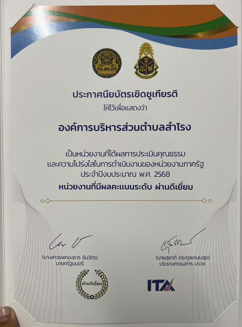 ประกาศนียบัตรเชิดชูเกียรติ เพื่อแสดงว่า องค์การบริหารส่วตำบลสำโรง เป็นหน่วยงานที่ได้รับผลการประเมินคุณธรรมและความโปร่งใสในการดำเนินงานของหน่วยงานภาครัฐ ประจำปีงบประมาณ พ.ศ.2568 เป็นหน่วยงานที่มีผลคะแนนระดับ ผ่านดีเยี่ยม